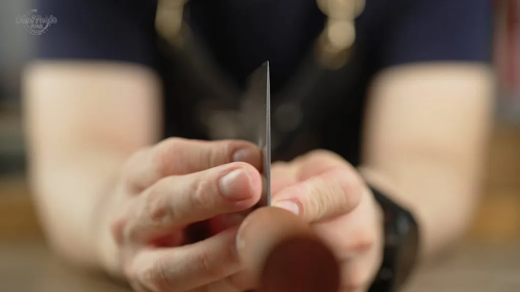 The balance point is at the logo area, and when pinching the knife near the front of the cap, the knife feels front-heavy. This front-heavy balance, combined with the slightly curved front, makes the knife well-suited for up-and-down chopping motions. Weighing 278 grams, it’s neither too light nor too heavy for this style of knife.